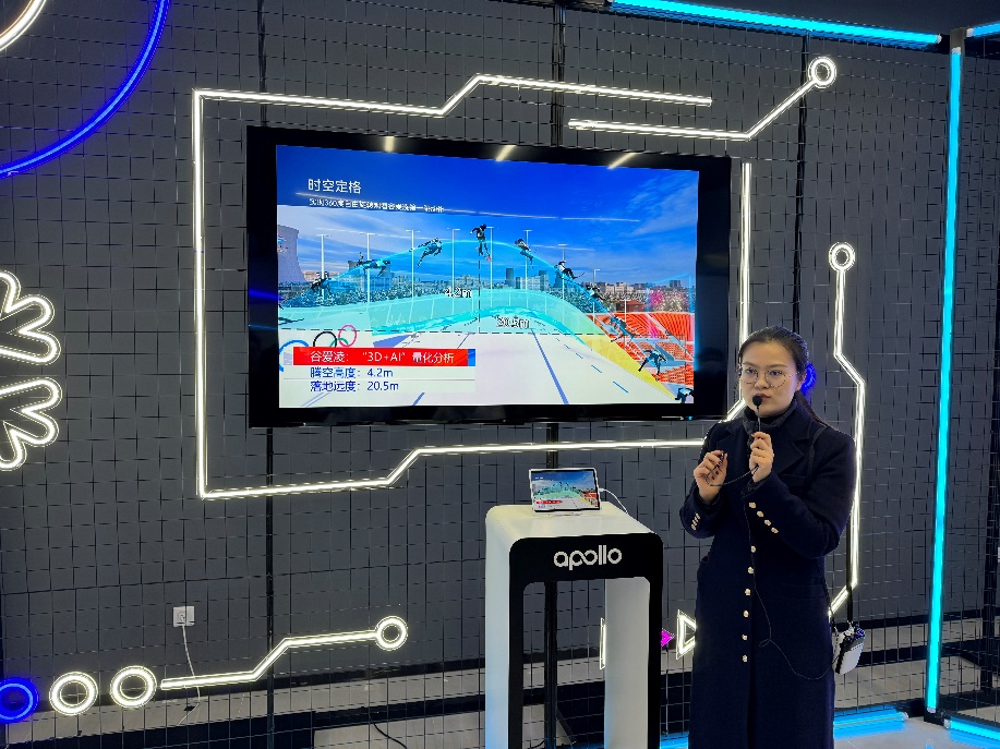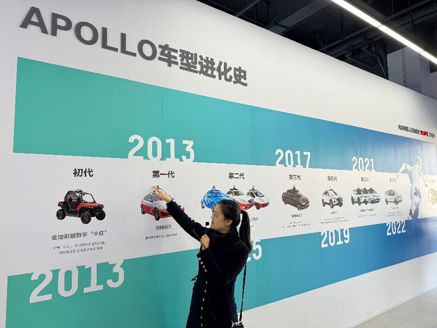 随后,同学们在讲解员的带领下来到展厅,参观了百度Apollo的自动驾驶产品以及百度推出的各种AI产品。从聚焦家庭场景的智能健身镜、到用于体育运动量化分析的AI技术和精确的AI教练、再到充满趣味的文心一格,以及提供更加贴心服务的百度地图,种种AI产品让同学们感受到人工智能技术的实际应用给我们生活带来的改变。讲解员为我们讲解了百度Apollo自动驾驶车辆的代际变更,让我们感受到了智能驾驶技术的突飞猛进、成本的降低以及未来的巨大潜力。
