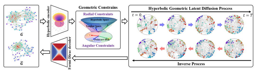 针对上述挑战,本文提出了一个全新的几何潜在扩散框架HypDiff。首先,建立了一个基于双曲几何的具有可解释性度量的几何潜在空间,以定义图的各向异性潜在扩散过程。其次,通过在双曲空间中聚类后转移到切平面的方法,更好地捕捉图的局部拓扑特征并解决黎曼高斯分布破坏扩散过程马尔科夫链的问题。最后,基于流行吸引力法则,我们提出了一个同时受径向和角度属性约束的几何潜在扩散过程,从而确保在生成图中保留推图结构原始的拓扑属性。大量实验结果表明,HypDiff在生成具有各种拓扑结构的图时表现都十分出色。