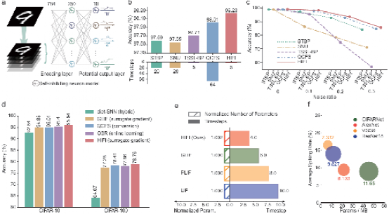 图2. a-d: 自抑制脉冲神经元准确再现了单个神经元的统计特性,展现了其优异的动力学拟合能力