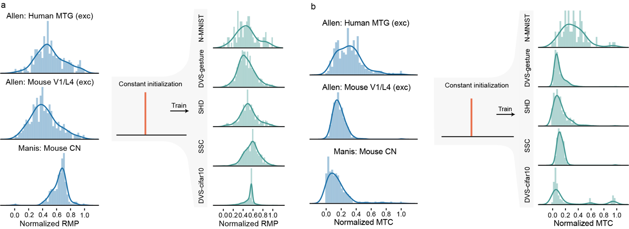 HIFI在多个广泛应用的数据集上展现了卓越的计算性能,包括静态数据集(MNIST、CIFAR10、CIFAR100、ImageNet)和神经形态数据集(NMNIST、DvsGesture、SHD、SSC、CIFAR10-DVS)。相比传统模型,HIFI实现了更快、更高、更强:处理速度提高最多5倍,准确性最多提高10%,能耗降低最多17.83倍(图3)。此外,HIFI从神经形态数据中学习到的神经元参数在分布特性上与哺乳动物神经元的参数呈现相似性(图4),表明该模型不仅具有优异的性能表现,还在一定程度上具备生物学上的合理性,进一步支持了其在类脑计算领域的应用前景。
