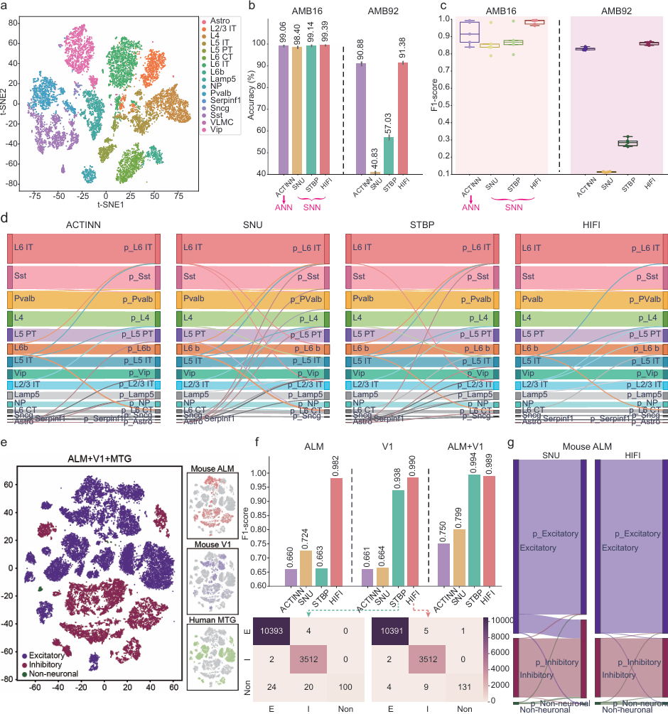 HIFI模型凭借其高效能和低延迟的特点,在高维度、大规模单细胞转录组测序(scRNA-seq)分析中展现了独特优势(图5)。研究表明,HIFI能够从scRNA-seq数据中精确识别出罕见的细胞类型,如Sncg、Serpinf1和Astro等。尽管这些细胞在样本中所占比例极低(如仅占0.09%),它们却是多种重大脑部疾病的关键生物标志物,包括多系统萎缩(Sncg)、胶质母细胞瘤(Serpinf1)和脑水肿(Astro)。这一发现不仅展示了HIFI在处理复杂生物数据中的潜力,也为疾病的诊断和治疗提供了新的研究方向。