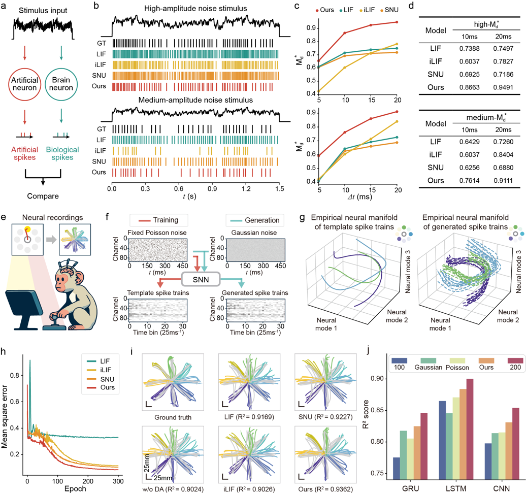 可训练的自抑制神经元为探索哺乳动物脑神经元复杂的神经动力学提供了新的视角。研究表明,所提出的模型能够准确再现单个神经元和神经元群体在统计学上的特性,显著提升了人工神经元的动力学拟合能力(图2a-d)。该模型在脑机接口数据的解码任务中表现出较高的效率,展示了其作为神经网络构建单元的潜力(图2e-j)。这种自抑制神经元模型为理解大脑信息处理机制提供了生物学上的保真性,也为开发更高效的人工智能系统奠定了基础。