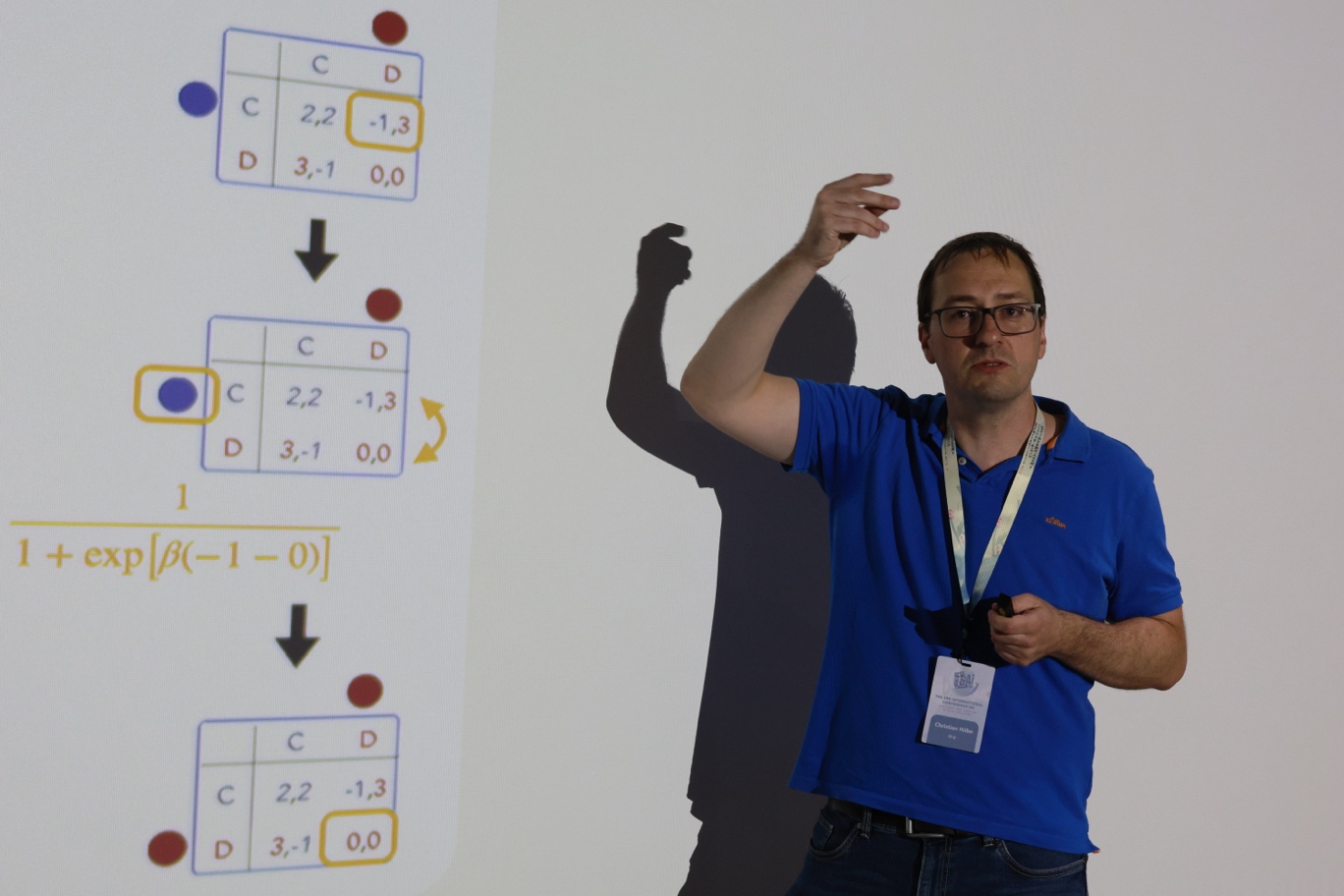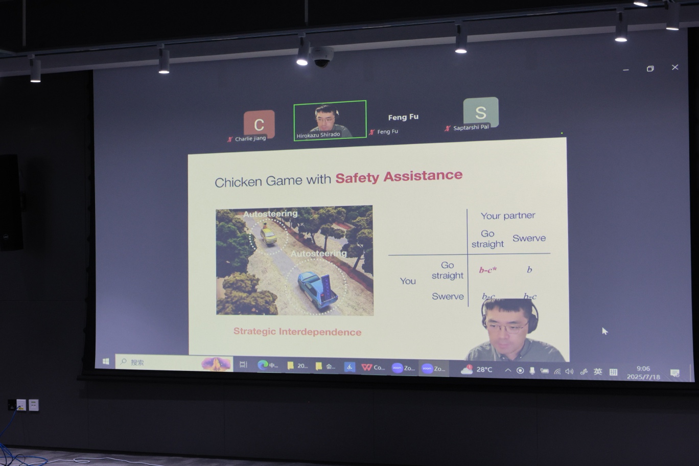 会议期间,多位专家为老师和同学们带来了精彩纷呈的学术报告。卡内基梅隆大学的Hirokazu Shirado教授以无人驾驶中的冲突协调问题为切入点,提出如何用人机混合智能提升系统的决策水平;电子科技大学的陈小杰教授以演化博弈为理论基础,剖析了群体策略演化、群体决策的复杂动态及其调控方法;上海人工智能实验室的胡舒悦研究员系统介绍了基于大语言模型的多智能体系统中合作行为与社会规范的演化和涌现;阿姆斯特丹大学的Fernando P. Santos教授介绍了大语言模型如何评判并影响人类决策;日本理化学研究所的Nikoleta E. Glynatsi研究员分享了其在寻找重复博弈占优策略方面的理论与应用成果,并以开源社区贡献者的身份,进行了面向博弈论的Python编程教学;奥地利IT:U的Christian Hilbe教授深入讲解了非最优学习机制的演化及其在不同类型博弈中的影响;哈佛大学的Saptarshi Pal博士介绍了重复博弈中单步记忆策略的纳什均衡及其性质;密歇根大学的Ran Zhuo教授以NIH基金分配决策问题为背景,基于大规模实证数据提出了高效的算法模型,助力社会资源分配与创新研究;北京大学的朱露莎教授介绍了如何结合人类行为实验、计算建模、fMRI和图神经网络,研究具有社交网络结构的群体学习、表示和决策过程的系列进展。