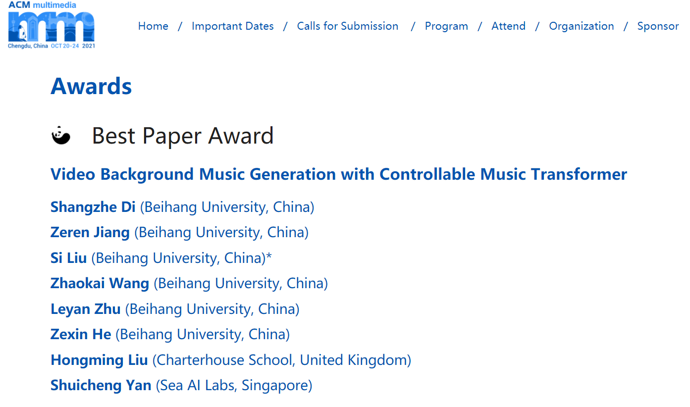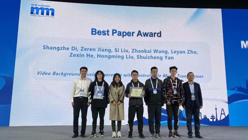 202110月20日至24日,第29ACM国际多媒体会议(ACM International Conference on Multimedia,简称ACM MM)线上线下同时举行,北航2020级硕士生狄尚哲与姜泽仁为共同第一作者,永利集团刘偲副教授为通讯作者的论文Video Background Music Generation with Controllable Music Transformer”获得了唯一最佳论文奖。该论文建立了视频画面与背景音乐在节奏上的对应关系,并首次提出为视频生成背景音乐的自动化方法。